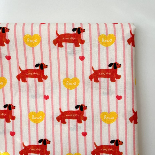 ダックスフンドとハートのモチーフが可愛い、 綿100%のデジタルプリント生地です♪ ピンクのストライプに、 黄色や赤のハートがアクセントになっていて、 ポップで元気な雰囲気に☺︎ 巾着袋やポーチ、エコバッグ、などの 布小物作りにぴったり♡ お子さまグッズやペットアイテムにも おすすめです!! ◌伸縮性 : なし ◌厚み : 薄手〜普通 ◌透け感 : ややあり ☑︎ 数量1=0.5y=45cm ※ご注文数繋げてカットいたします✂︎ ☑︎生地幅:約143cm ☑︎生地素材:綿 100% ☑︎色柄:1色(画像参照) _♡one color ☑︎商用利用可能 ⚫︎ クリックポスト対象生地⚫︎ 薄手生地のため1 yard〔数量2〕まで クリックポスト(¥200)にてご対応可能です! ※他対象生地と0.5yardずつも可能。 ご希望の場合は送料選択の際、クリックポストをお選びください。 ----------------------------------- ⚠︎注意事項⚠︎ ・こちらの生地は素材の特性上、折りジワがつきやすく、仕入れ時点で強めのシワがある部分もございます。アイロンをかけていただくことで解消できますので、不良ではございません。あらかじめご了承ください。 ・撮影環境やモニターの明るさにより実際の 色味と見え方に差が生じる場合があります。 ご購入前に必ずご一読ください⇩ https://popmimi.base.shop/about